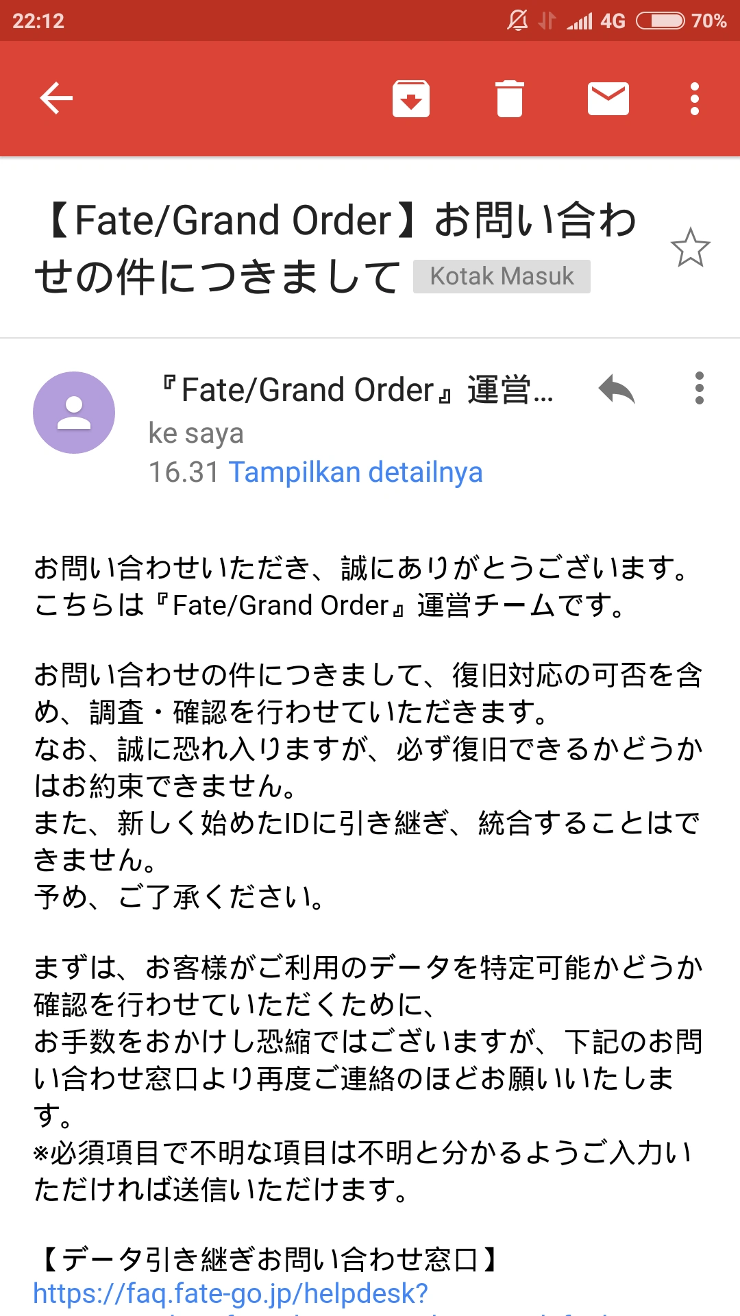 運営から引き継ぎナンバーを発行してもらって無事解決 Fate Grand Orderのデーターの引き継ぎに失敗して運営に連絡中 運営からの自動返信メールは迷惑メールに入っていた チャリオでカメオ